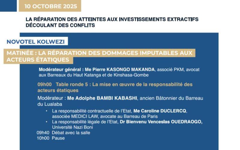 Pendant deux jours, Kolwezi a accueilli des échanges de haut niveau autour d’un enjeu à la fois sensible et stratégique : les investissements extractifs en zones de conflits. Ce sujet complexe, à la croisée du droit international, des intérêts économiques, des politiques publiques et des attentes sociétales, a donné lieu à des discussions approfondies sur les cadres juridiques et les pratiques à adopter dans ces contextes.